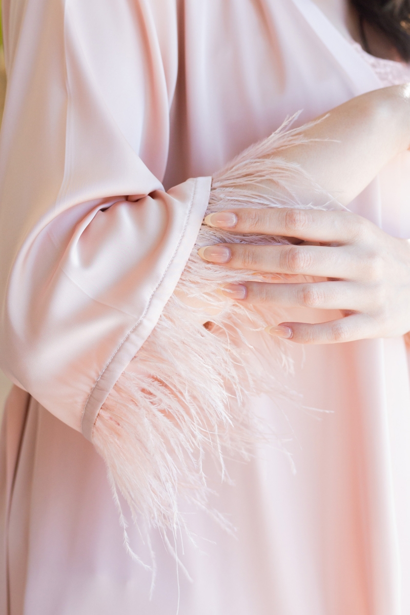 - Un kimono court avec manches ornées de plumes et une ceinture en satin