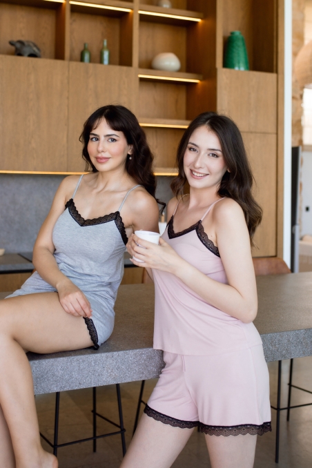 Disponible en gris ou rose pâle, ce pyjama léger est idéal pour les nuits d'été ou pour vous détendre à la maison avec élégance.