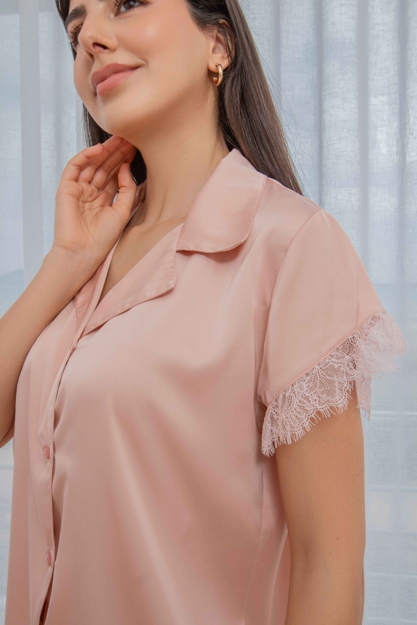 - Short : En satin de soie, ce short est orné d'une insertion de dentelle délicate sur les bords des cuisses, ajoutant une touche féminine et élégante.