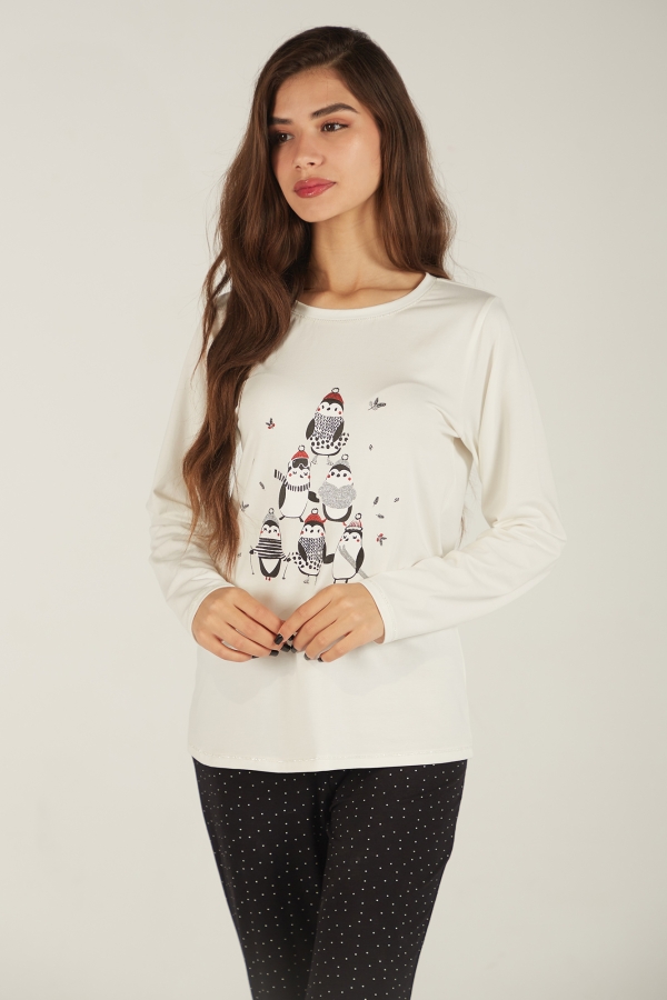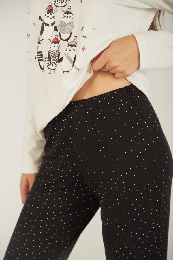 Pyjama féminin en coton doux avec pingouins imprimés sur le T-shirt et pantalon à petits points. Ensemble 2 pièces, idéal pour des nuits confortables. Tailles S à XXL.