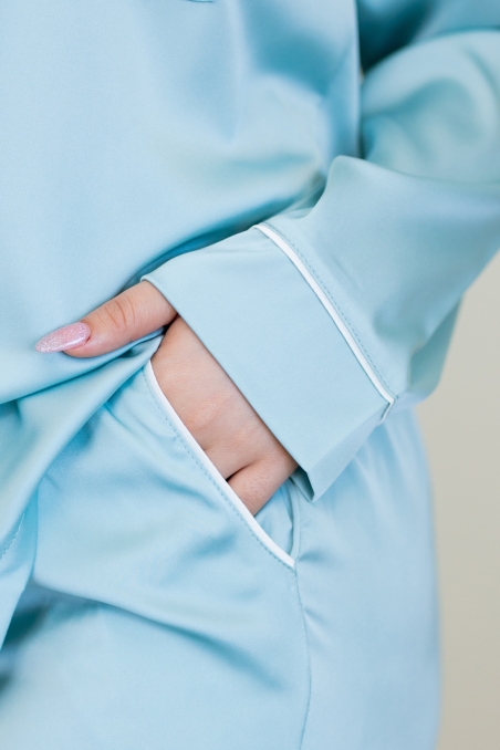 Pyjama 2 pièces oversize en satin doux, style boyfriend. Composé d'une chemise boutonnée et d'un pantalon ample. Disponible en rose ou bleu.
