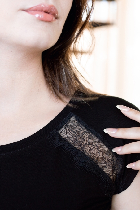 - Un haut à manches courtes en coton viscose doux, avec une insertion raffinée de dentelle ton sur ton sur les épaules