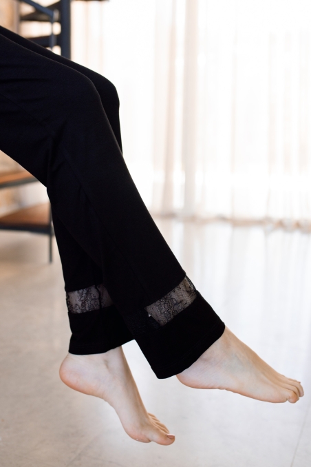 - Un pantalon long fluide avec une finition en dentelle transparente au bas des jambes, assortie à la couleur du pyjama