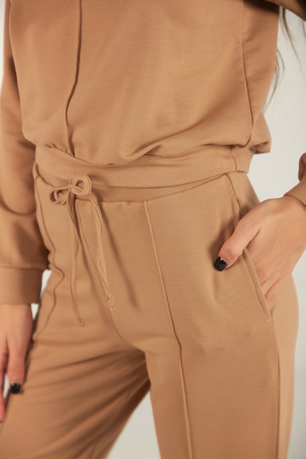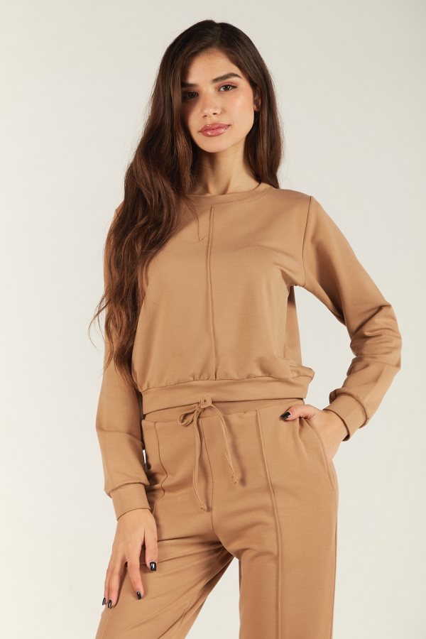 Ensemble jogging pour femme en molleton doux : pull court et pantalon avec nervures décoratives. Confort et style au rendez-vous. Tailles S à XL.