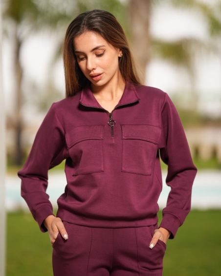 Composé d’un haut à manches longues avec fermeture zippée et poches poitrine et d’un pantalon fluide à la coupe élégante, cet ensemble se porte aussi bien à la maison qu’en sortie, pour un look sport chic parfaitement maîtrisé.