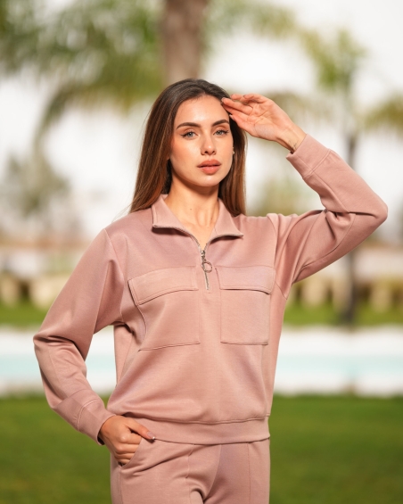 Composé d’un haut à manches longues avec fermeture zippée et poches poitrine et d’un pantalon fluide à la coupe élégante, cet ensemble se porte aussi bien à la maison qu’en sortie, pour un look sport chic parfaitement maîtrisé.