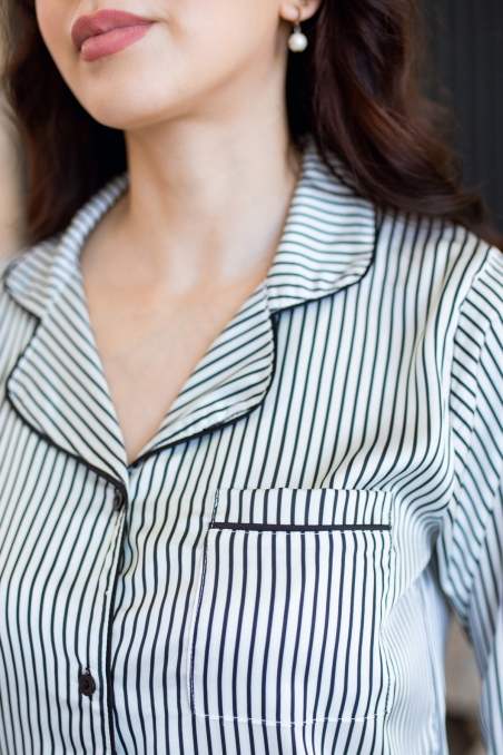 Adoptez l’élégance minimaliste avec cet ensemble pyjama 2 pièces style boyfriend en satin rayé noir et blanc.