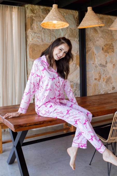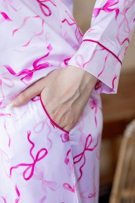 Pyjama oversize femme en satin de soie rose à motifs nœuds. Ensemble 2 pièces confortable & chic.