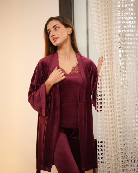 Ensemble de pyjama 3 pièces en velours doux pour femme, composé d’un débardeur à dentelle, d’un pantalon long élégant et d’un kimono fluide. Un pyjama chic et confortable signé Glossy Envy, idéal pour des nuits raffinées et des moments de détente à la maison.