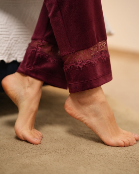 Cet ensemble se compose d’un débardeur délicat orné de dentelle, d’un pantalon long à la coupe fluide avec finitions en dentelle, ainsi que d’un kimono assorti doté de manches larges et d’une ceinture à nouer. Le velours apporte une sensation de douceur incomparable et une allure chic, parfaite pour toutes les saisons.