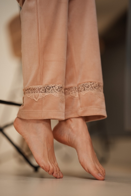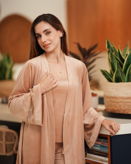 Cet ensemble se compose d’un débardeur délicat orné de dentelle, d’un pantalon long à la coupe fluide avec finitions en dentelle, ainsi que d’un kimono assorti doté de manches larges et d’une ceinture à nouer. Le velours apporte une sensation de douceur incomparable et une allure chic, parfaite pour toutes les saisons.