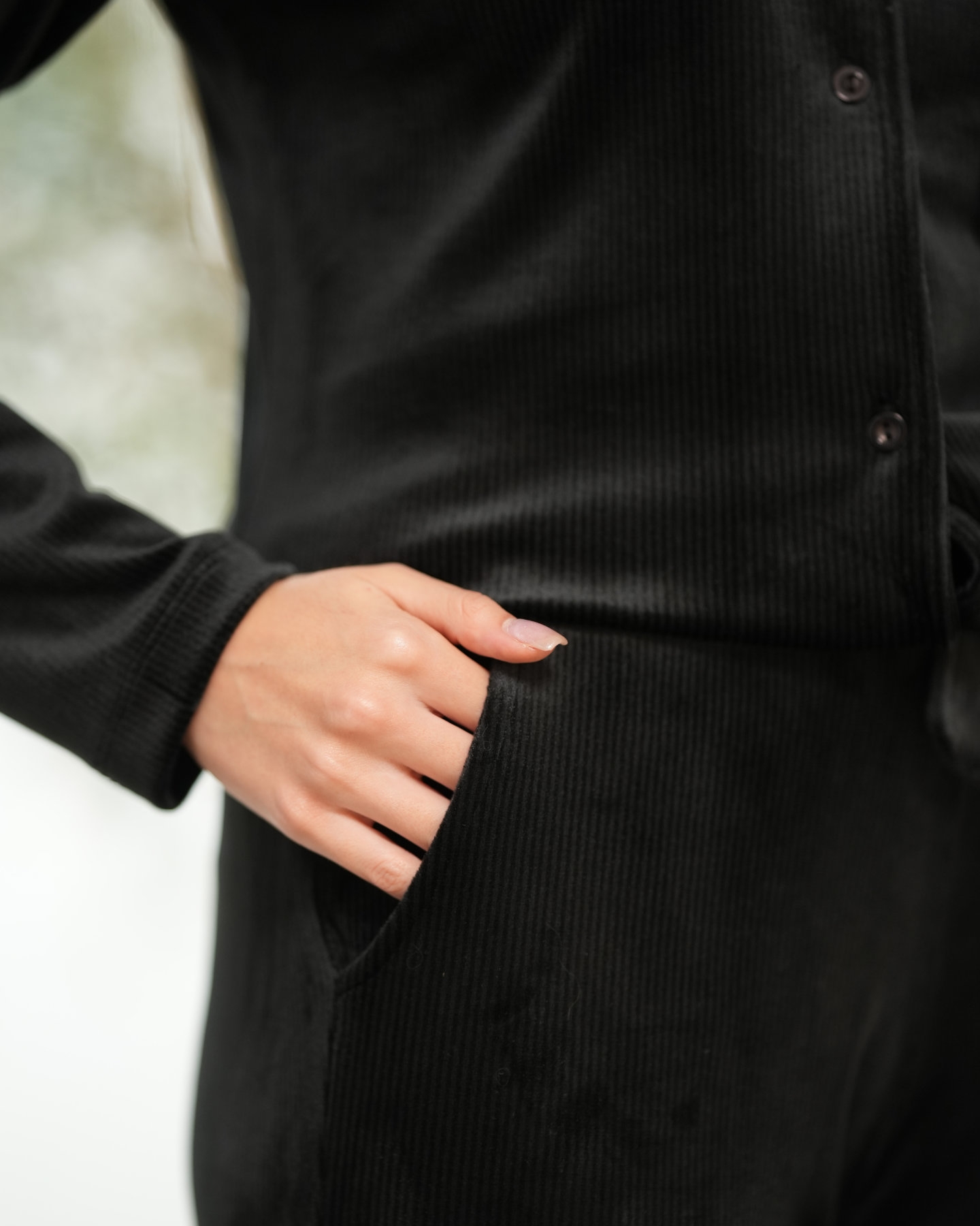 La chemise boutonnée apporte une touche raffinée, tandis que le pantalon fluide assure une liberté de mouvement totale.